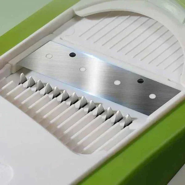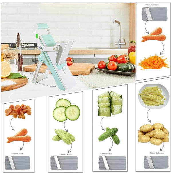 Este cortador no es sólo un utensilio de cocina, sino un verdadero ayudante culinario. Con cuchillas intercambiables y espesor ajustable, permite cortar en diferentes estilos como rodajas, tiras, juliana y cubos.